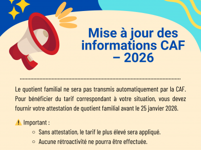 Dans le cadre de la mise à jour du Portail Famille pour l’année 2026, nous vous informons que le quotient familial ne sera pas transmis automatiquement par la CAF. Afin de bénéficier du tarif correspondant à votre situation, il est indispensable de fournir une attestation de quotient familial avant le 25 janvier 2026.